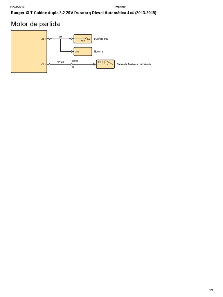 Este documento descreve o diagrama de cabos da bateria de um Ranger XLT Cabine dupla 3.2 20V Duratorq Diesel Automático 4x4 entre 2013-2015, mostrando a conexão entre a bateria, o motor de partida, os fusíveis F03 e F03i e a caixa de fusíveis da bateria.