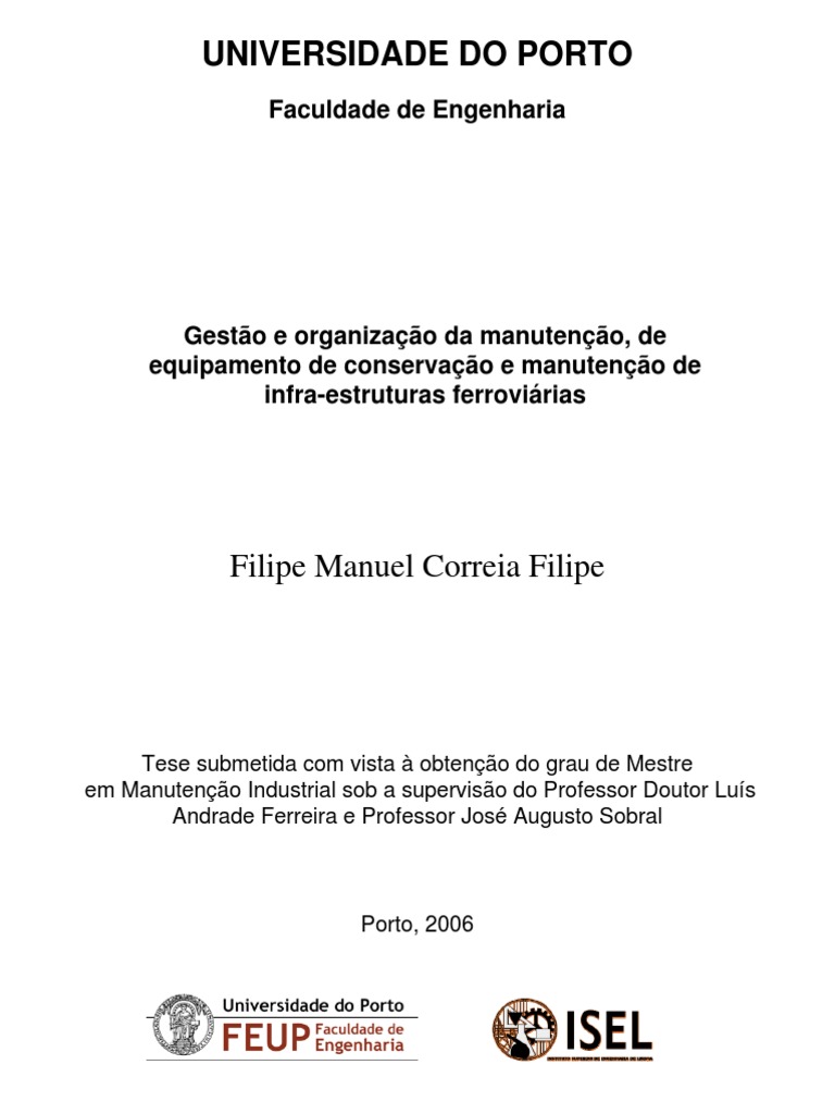 Tese submetida com vista obteno do grau de Mestre em Manuteno Industrial sob a superviso do Professor Doutor Lus Andrade Ferreira e Professor Jos Augusto Sobral