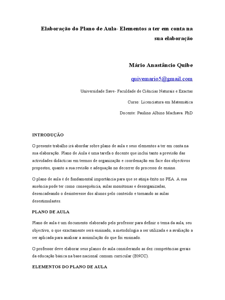 O presente trabalho irá abordar sobre plano de aula e seus elementos a ter em conta na