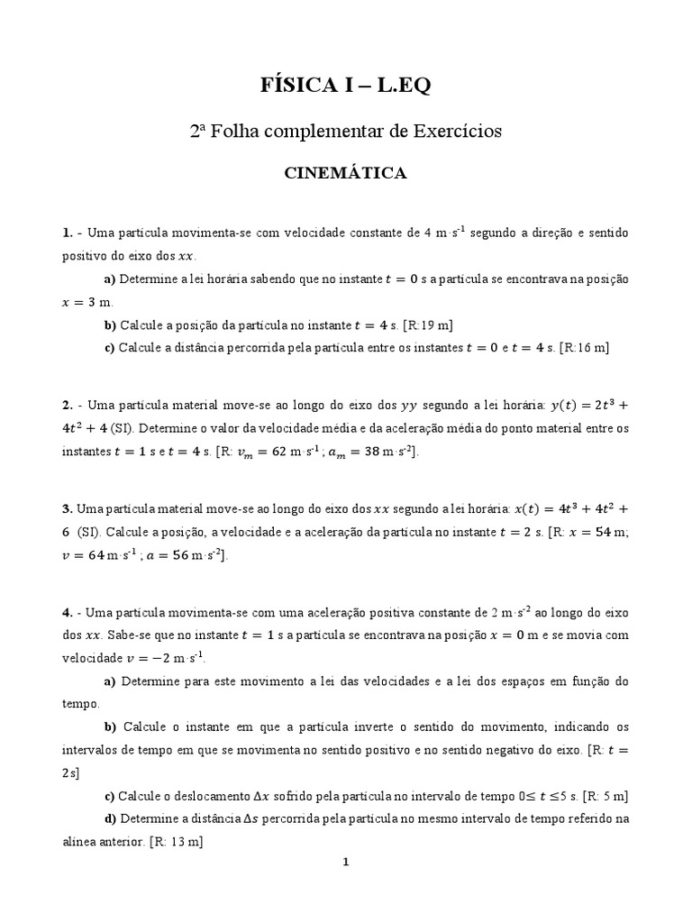 1. - Uma partícula movimenta-se com velocidade constante de 4 m·s-1 segundo a direção e sentido