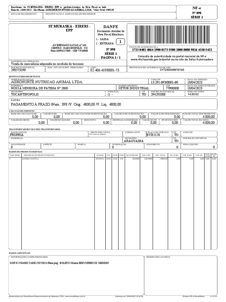 Emissão: 18/04/2023 Dest/Reme: AGRONORTE NUTRICAO ANIMAL LTDA Valor Total: 4800,00