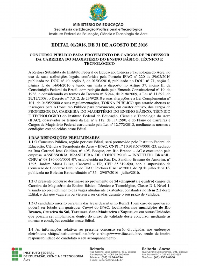 Oficial da União, e divulgado no endereço eletrônico www.ifac.edu.br, observado o