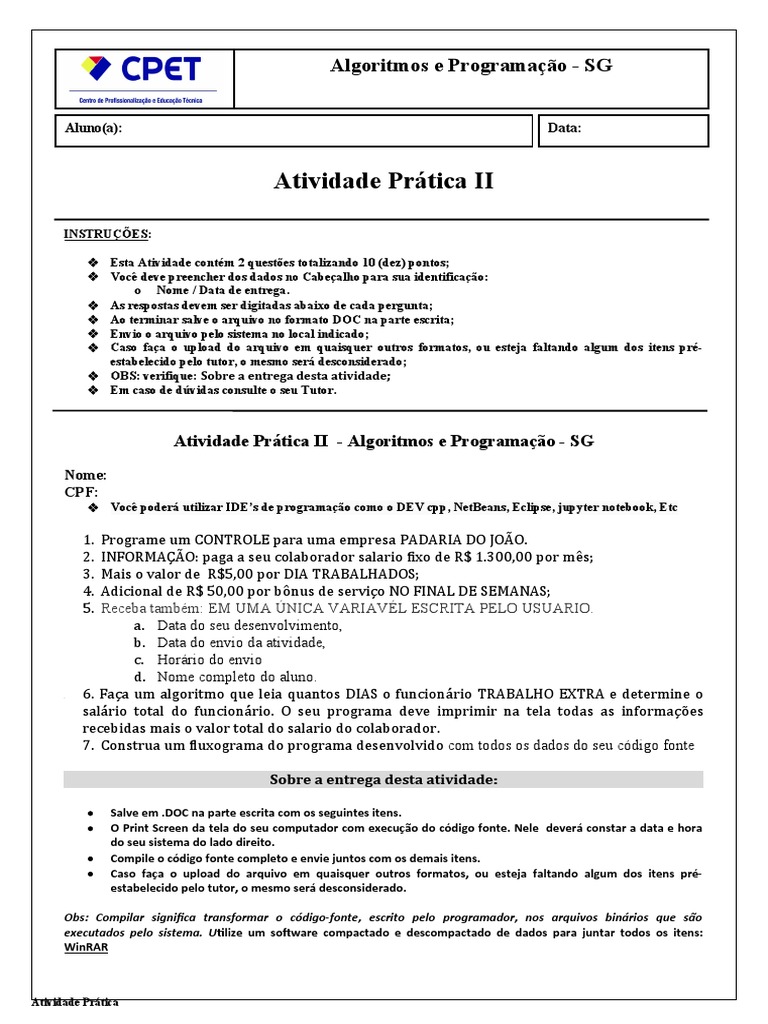 Esta Atividade contém 2 questões totalizando 10 (dez) pontos;