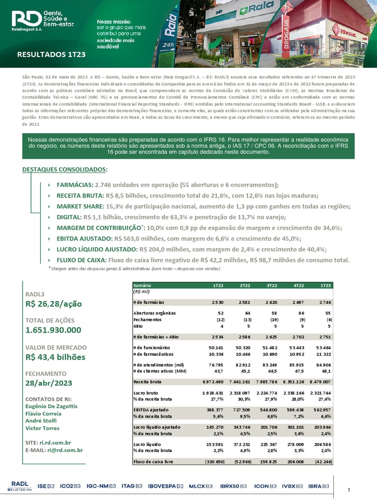 São Paulo, 02 de maio de 2023. A RD – Gente, Saúde e Bem-estar (Raia Drogasil S.A. – B3: RADL3) anuncia seus resultados referentes ao 1º trimestre de 2023