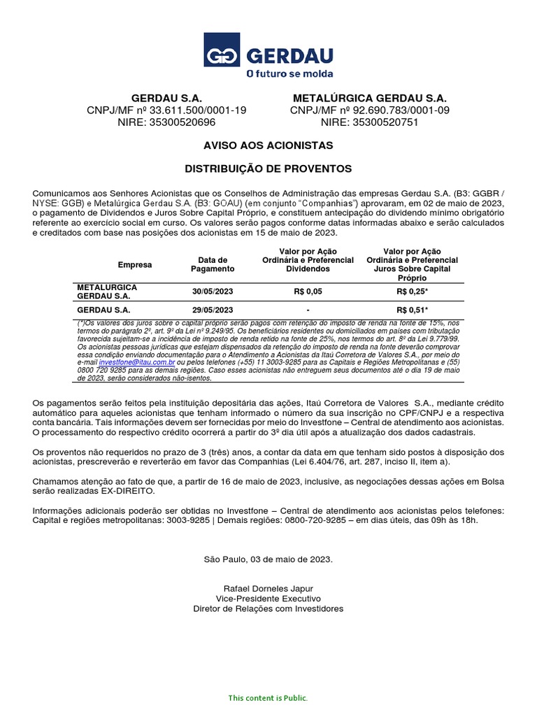 NYSE: GGB) e Metalúrgica Gerdau S.A. (B3: GOAU) (em conjunto “Companhias”) aprovaram, em 02 de maio de 2023,