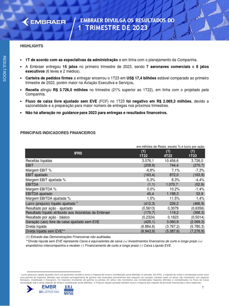 São Paulo, Brasil, 4 de maio de 2023 - (B3: EMBR3, NYSE: ERJ). As informações operacionais e financeiras da
