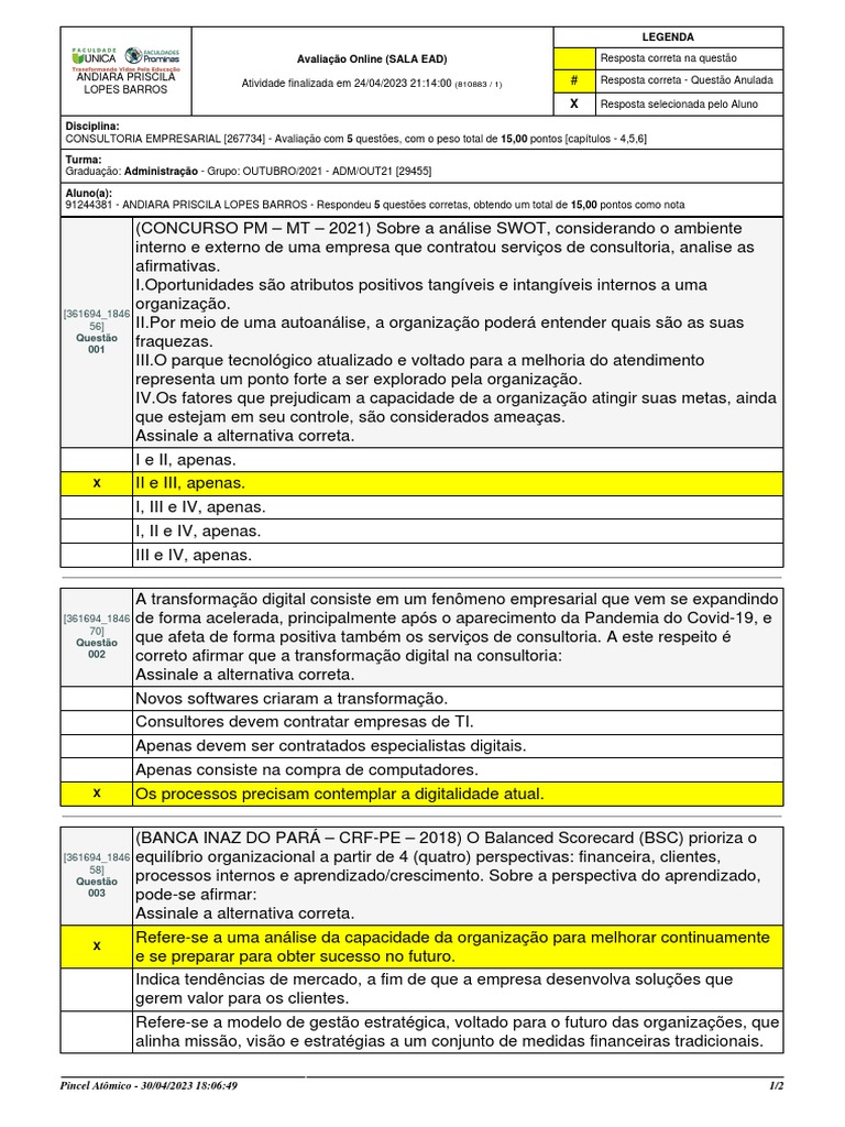 91244381 - ANDIARA PRISCILA LOPES BARROS - Respondeu 5 questões corretas, obtendo um total de 15,00 pontos como nota