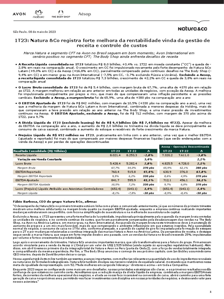 • Natura &Co Latam: A receita líquida do 1T23 cresceu +9,0% em CC e +2,4% em reais, impulsionada pelo sólido crescimento