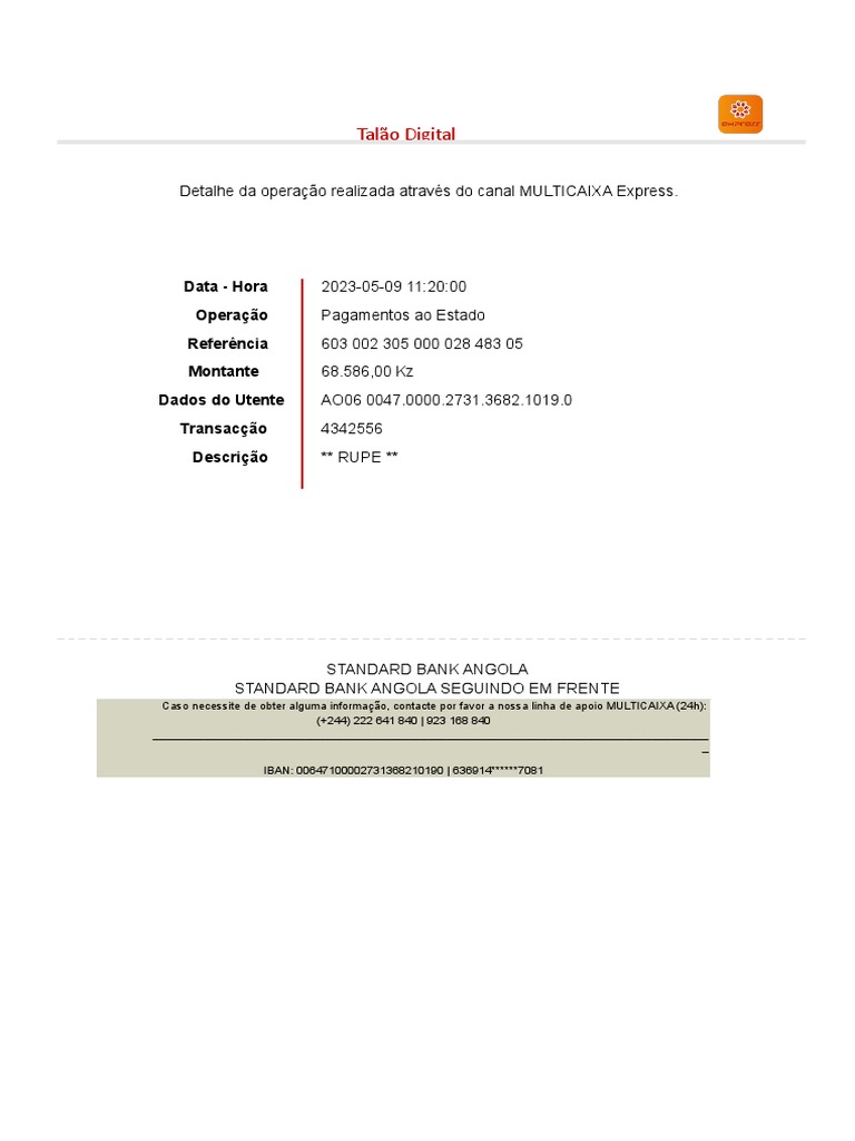 Detalhe da operação realizada através do canal MULTICAIXA Express.