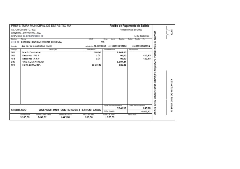 PREFEITURA MUNICIPAL DE ESTREITIO MA Recibo de Pagamento de Salário