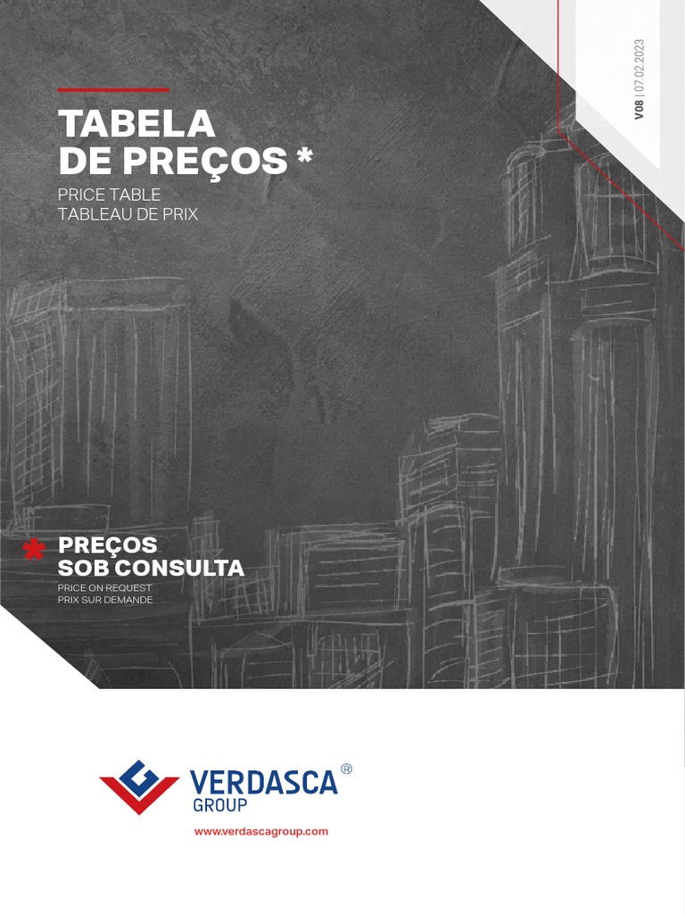 Este documento fornece uma tabela de preços para produtos de concreto fabricados pela Verdasca Group. A tabela inclui uma variedade de itens como blocos de alvenaria, dutos, tampas, pavimentos, meios-fios, vigas e telhados. Além disso, fornece informações sobre as empresas do grupo, suas instalações de produção e capacidade.