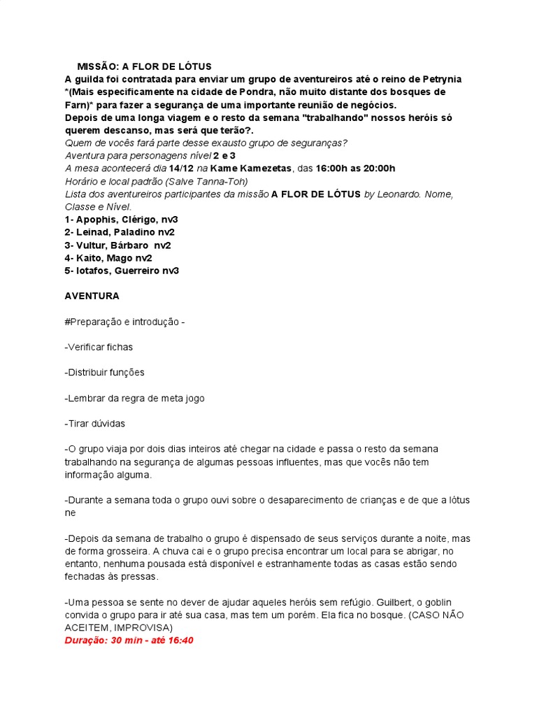 Lista dos aventureiros participantes da missão A FLOR DE LÓTUS by Leonardo. Nome,