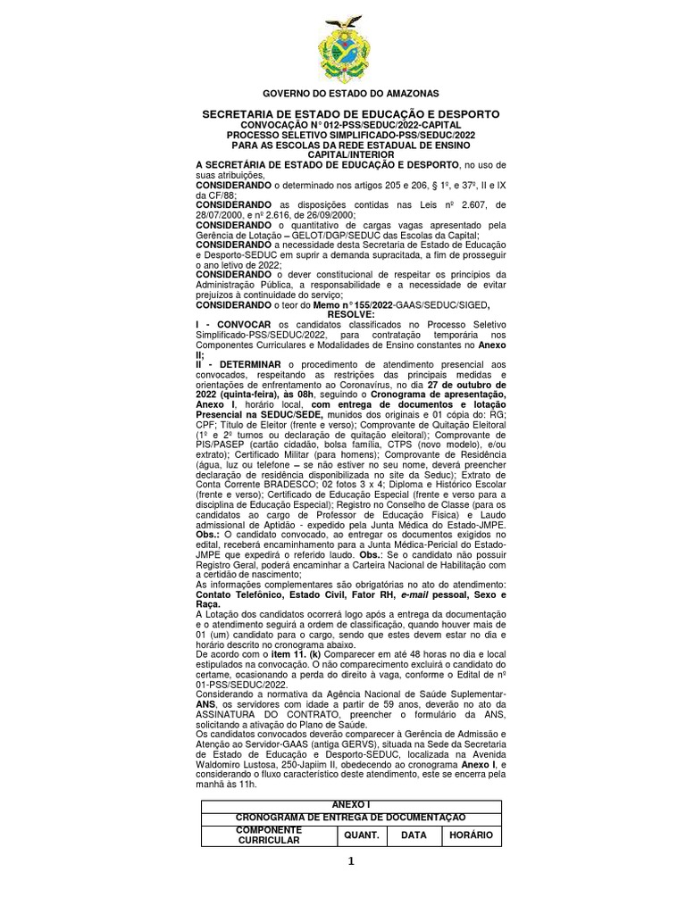 CONVOCAÇÃO N° 012-PSS/SEDUC/2022-CAPITAL