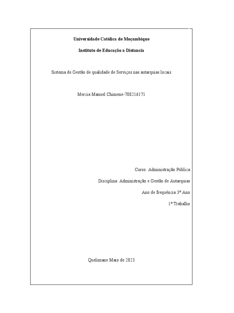 Analisar o sistema de gestão de qualidade nos serviços autárquicos Moçambicanos;