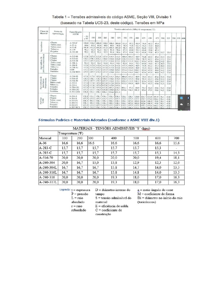 Formulas Padrées ¢ Materiais Adotados (conforme a ASME VIII div.1)