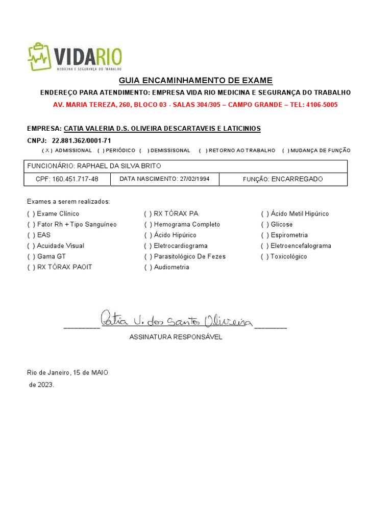 ENDEREÇO PARA ATENDIMENTO: EMPRESA VIDA RIO MEDICINA E SEGURANÇA DO TRABALHO