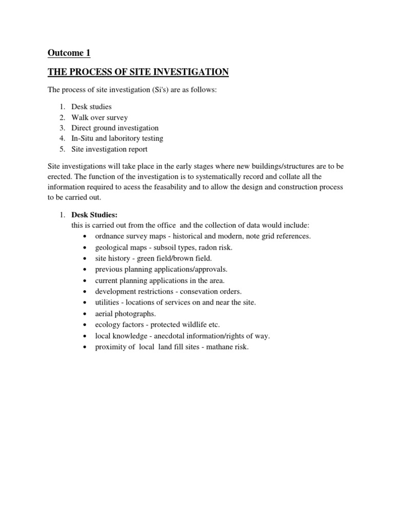 Site investigations will take place in the early stages where new buildings/structures are to be erected. The function of the investigation is to systematically record and collate all the information required to acess the feasability and to allow the design and construction process to be carried out. 1. Desk Studies: this is carried out from the office and the collection of data would include: ordnance survey maps - historical and modern, note grid references. geological maps - subsoil types, radon risk. site history - green field/brown field. previous planning applications/approvals. current planning applications in the area. development restrictions - consevation orders. utilities - locations of services on and near the site. aerial photographs. ecology factors - protected wildlife etc. local knowledge - anecdotal information/rights of way. proximity of local land fill sites - mathane risk.