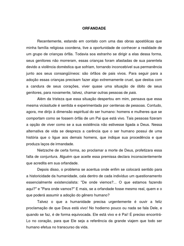 Recentemente, estando em contato com uma das obras apostlicas que minha famlia religiosa coordena, tive a oportunidade de conhecer a realidade de um grupo de crianas rfs. Todavia soa estranho se dirigir a elas dessa forma, seus genitores no morreram, essas crianas foram afastadas de sua parentela devido a violncia domstica que sofriam, tornando inconcebvel sua permanncia junto aos seus consangneos: so rfos de pais vivos. Para seguir para a adoo essas crianas precisam fazer algo extremamente cruel, que destoa com a candura de seus coraes, viver quase uma situao de bito de seus genitores, para novamente, talvez, chamar outras pessoas de pais. Alm da tristeza que essa situao despertou em mim, pensava que essa mesma vicissitude sentida e experimentada por centenas de pessoas. Contudo, agora, me dirijo dimenso espiritual do ser humano: homens e mulheres que se comportam como se fossem rfs de um Pai que est vivo. Tais pessoas fizeram a opo de viver como se a sua existncia no estivesse ligada a Deus. Nessa alternativa de vida se despreza a carncia que o ser humano possui de uma histria que o ligue aos demais homens, que indique sua procedncia e que produza laos de irmandade. Nietzsche de certa forma, ao proclamar a morte de Deus, profetizara essa falta de conjuntura. Algum que aceite essa premissa declara inconscientemente que acredita em sua orfandade. Depois disso, o problema se acentua onde enfim se colocar sentido para a historicidade da humanidade, cala dentro de cada indivduo um questionamento essencialmente existencialista: "De onde viemos?... O que estamos fazendo aqui?" e "Para onde vamos?" E mais, se a orfandade fosse mesmo real, quem e o que poder assumir a adoo do gnero humano? Talvez o que a humanidade precisa urgentemente ouvir a feliz proclamao de que Deus est vivo! No hodierno pouco ou nada se fala Dele, e quando se faz, de forma equivocada. Ele est vivo e Pai! preciso encontrLo no corao, para que Ele seja a referncia da grande viajem que todo ser humano efetua no transcurso da vida.