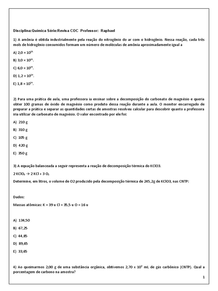 Disciplina:Química Série:Revisa COC Professor: Raphael
