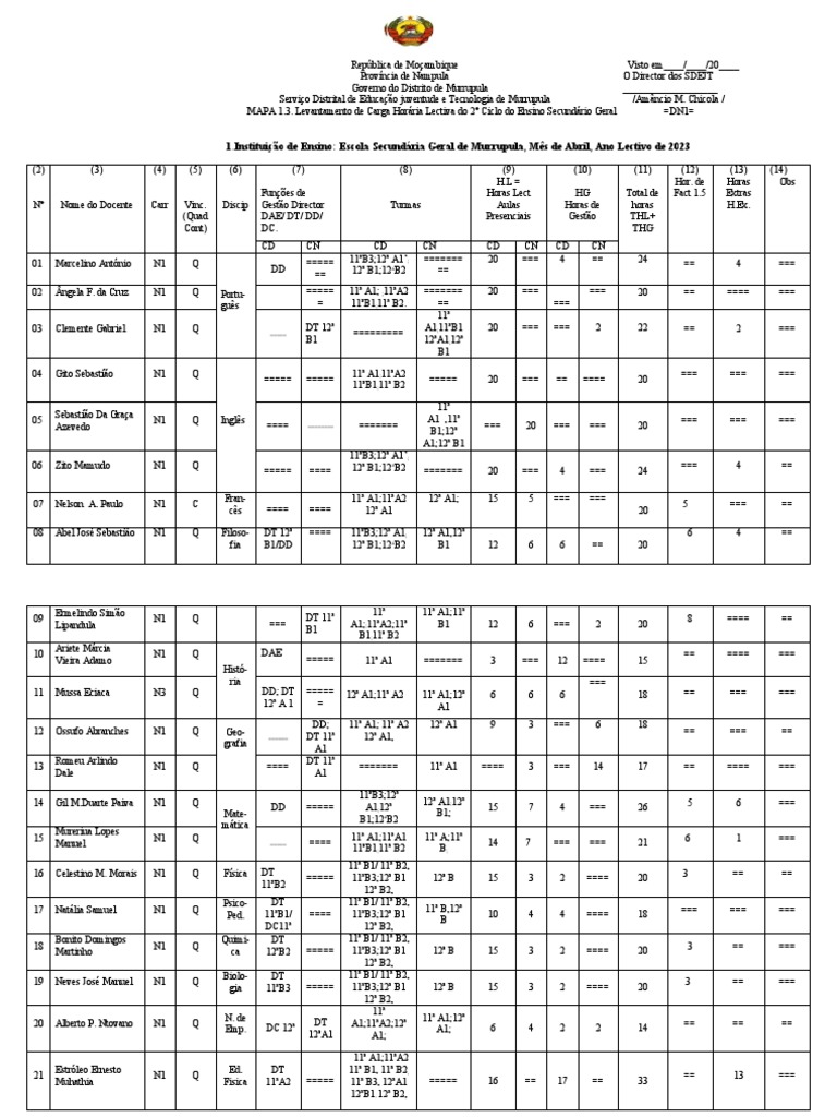 SDEJT – Serviço Distrital de Educação, Juventude e Tecnologia, THL- Total de Horas Lectivas, THG- Total de Horas de Gestão, DT- Director de Turma, DC- Director de Classe, DD- Delegado de Disciplina, CD-