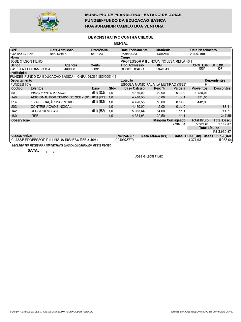BSIT-BR - BUSINESS SOLUTION INFORMATION TECHNOLOGY - BRASIL Emitido por JOSE GILSON FILHO em 28/04/2023 09:19.