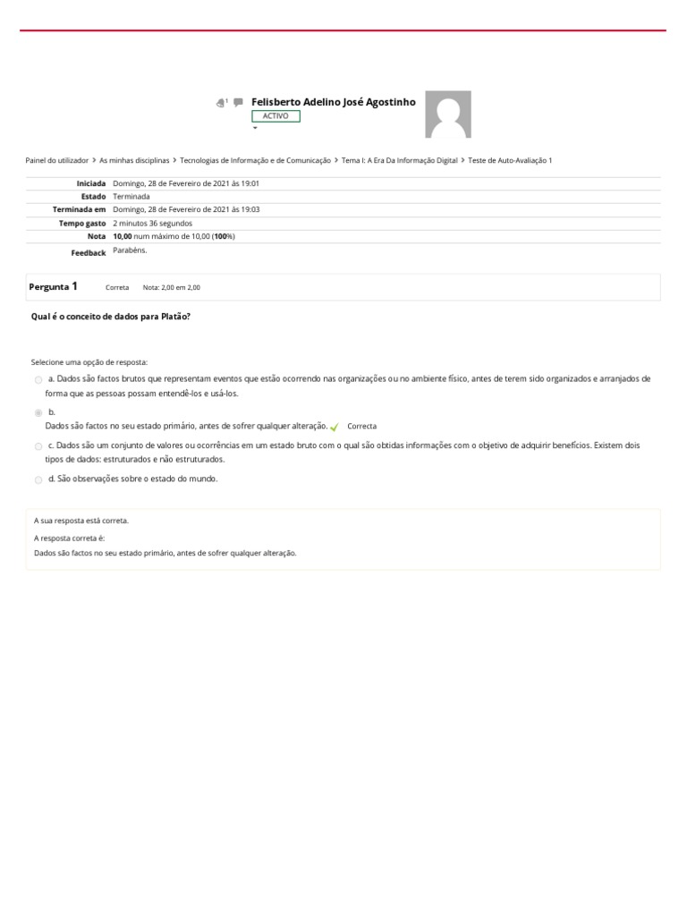 Painel do utilizador As minhas disciplinas Tecnologias de Informação e de Comunicação Tema I: A Era Da Informação Digital Teste de Auto-Avaliação 1