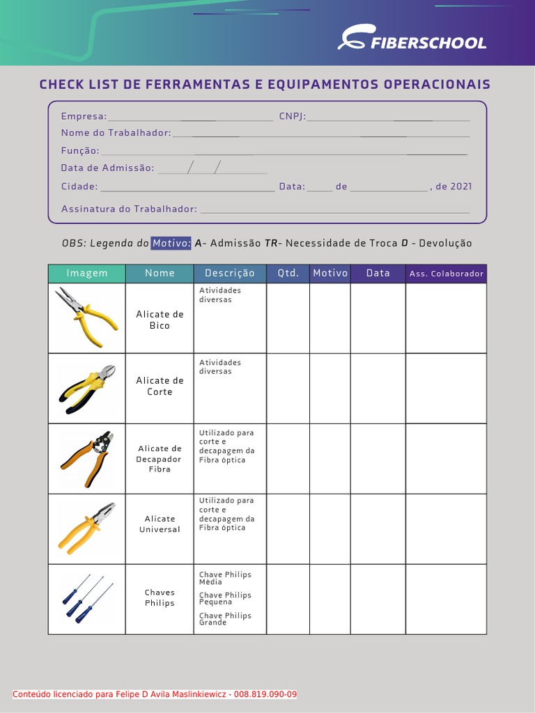 CHECK LIST DE FERRAMENTAS E EQUIPAMENTOS OPERACIONAIS