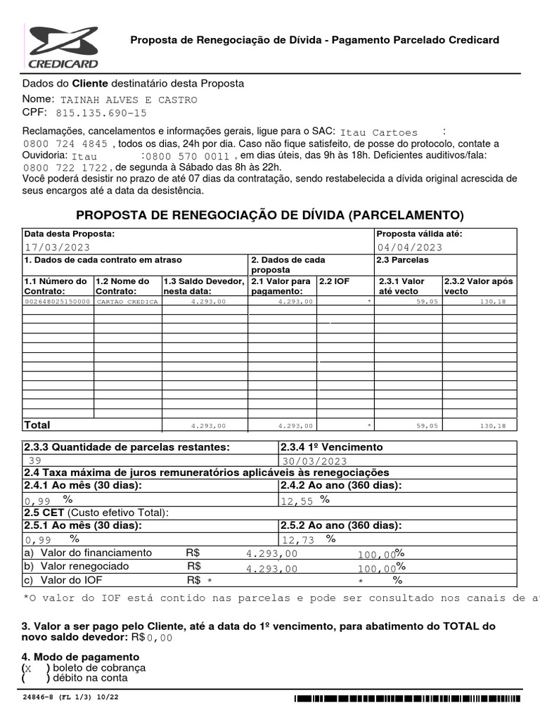Proposta de Renegociação de Dívida - Pagamento Parcelado Credicard
