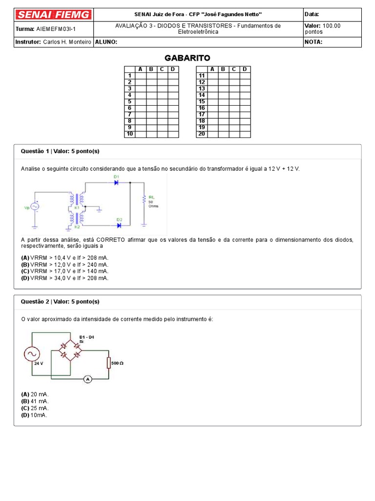 AVALIAÇÃO 3 - DIODOS E TRANSISTORES - Fundamentos de Valor: 100.00