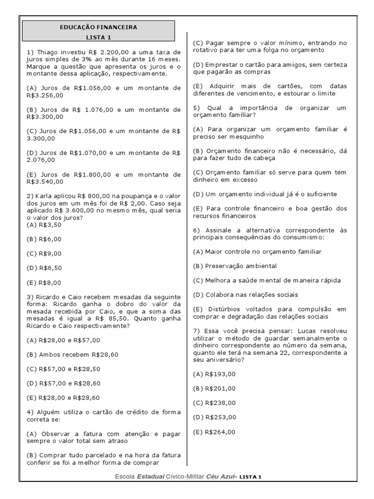 (E) Juros de R$1.800,00 e um montante de (C) Orçamento familiar só serve para quem tem