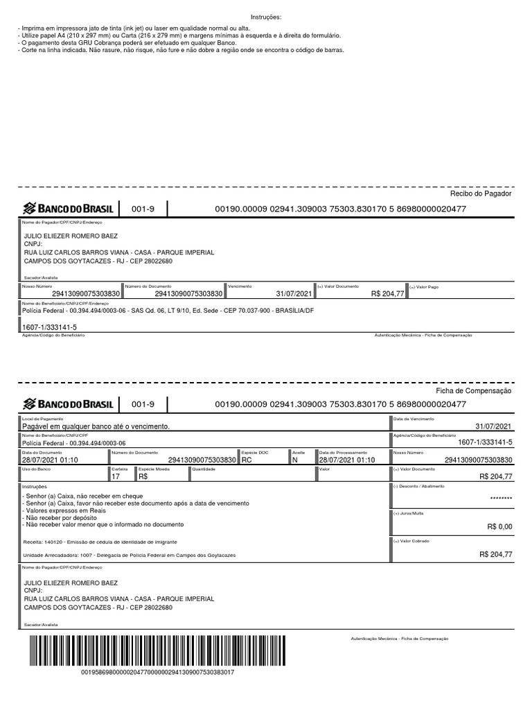 Pagável em qualquer banco até o vencimento. 31/07/2021