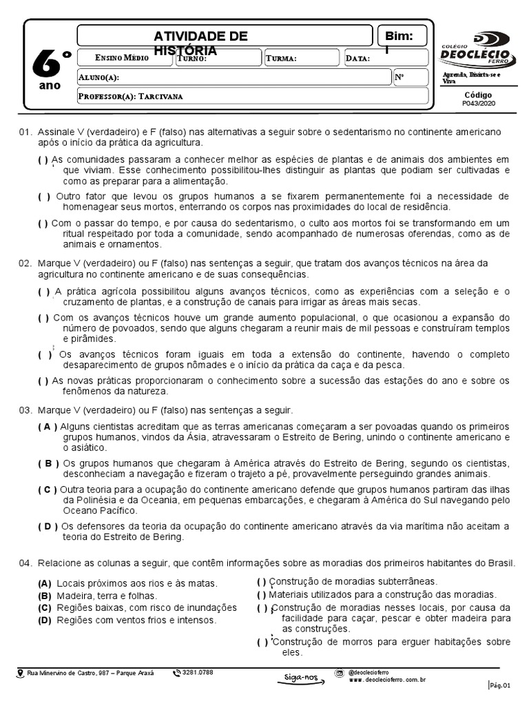 03. Marque V (verdadeiro) ou F (falso) nas sentenças a seguir.