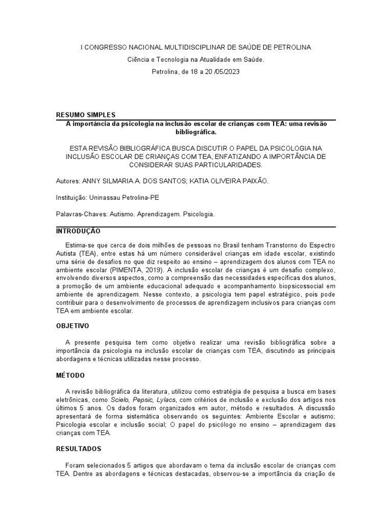 A importância da psicologia na inclusão escolar de crianças com TEA: uma revisão