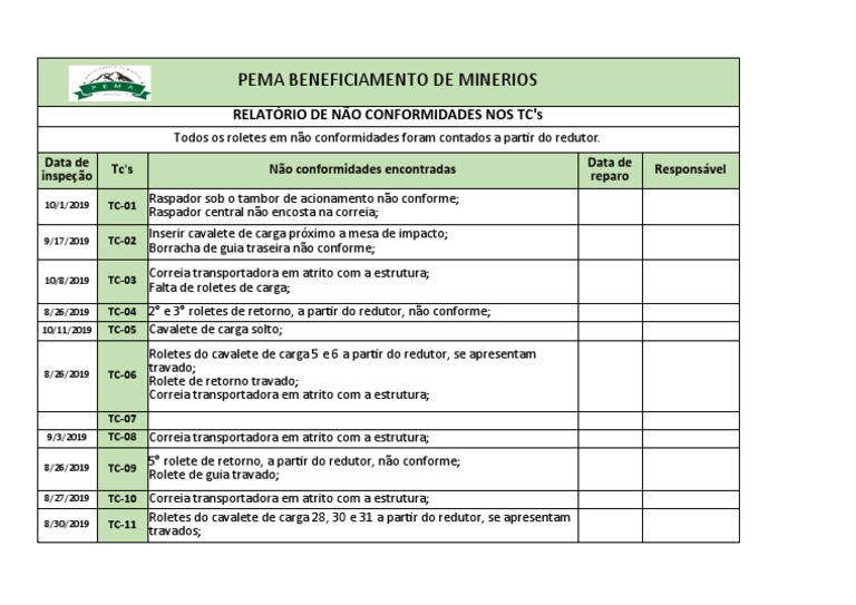 inspeção Tc's Não conformidades encontradas reparo Responsável