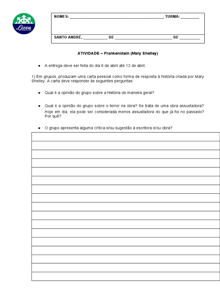 ATIVIDADE – Frankenstein (Mary Shelley)