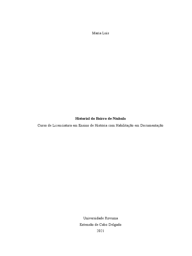 O trabalho em destaque tem como tema: Historial do Bairro de Niuhula. Para surgir o nome