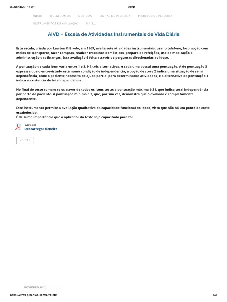 AIVD – Escala de Atividades Instrumentais de Vida Diária