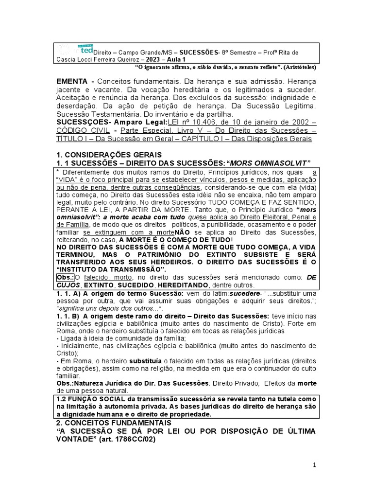 1. 1. A) A origem do termo Sucessão: vem do latim:sucedere- “...substituir uma