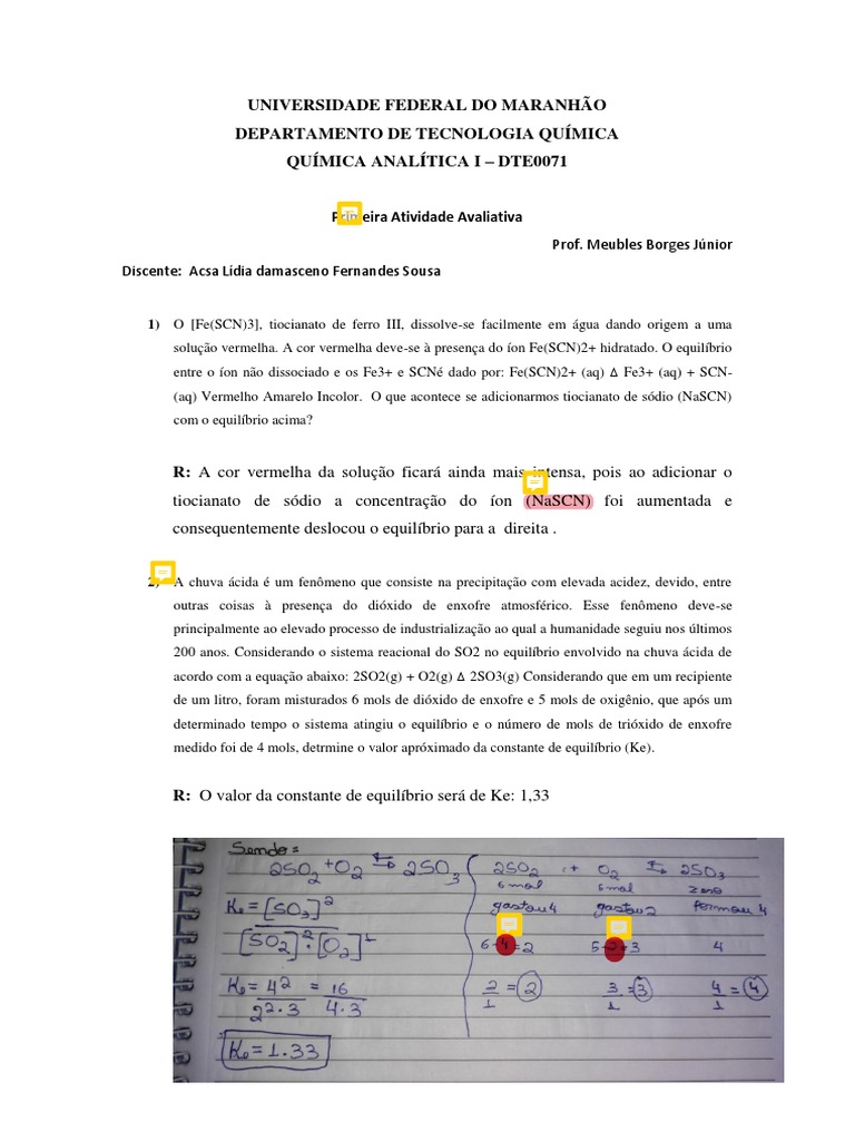 R: O valor da constante de equilíbrio será de Ke: 1,33