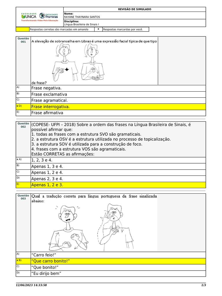 Respostas corretas são marcadas em amarelo X Respostas marcardas por você.