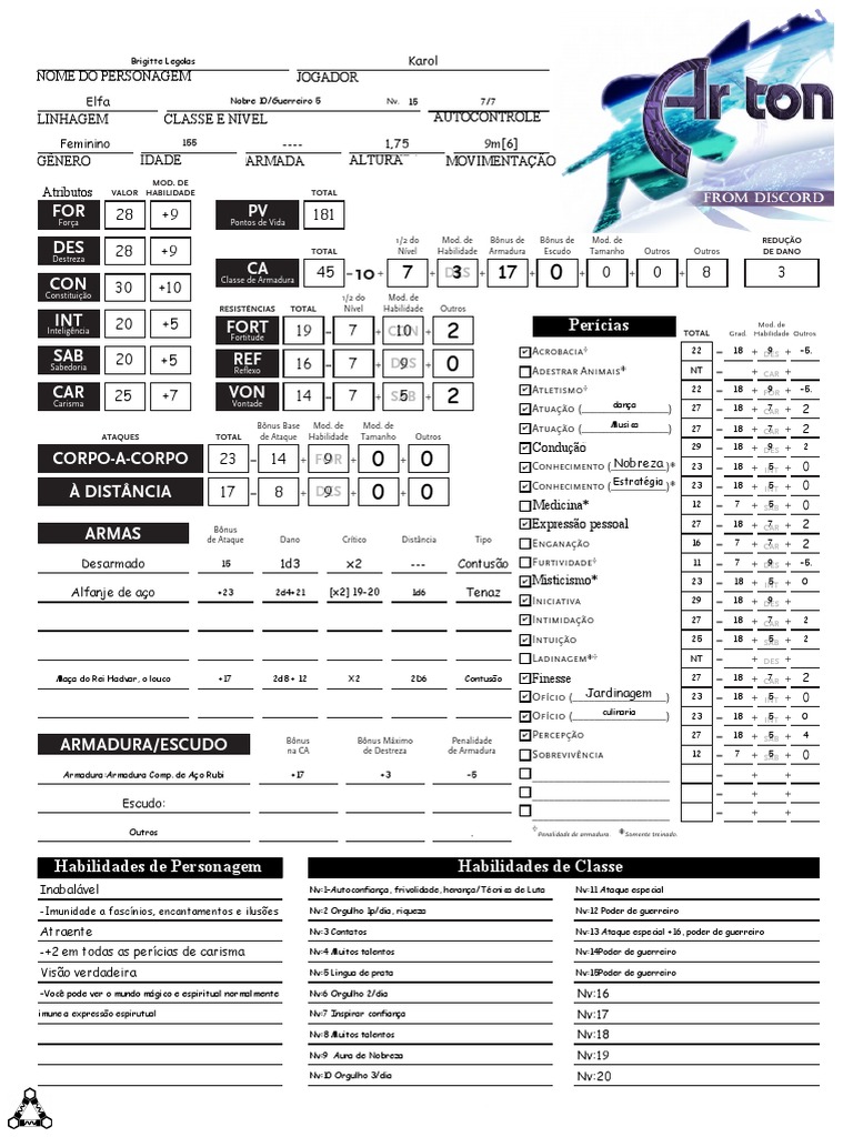 28 +9 TOTAL Nível Habilidade Armadura Escudo Tamanho Outros Outros DE DANO