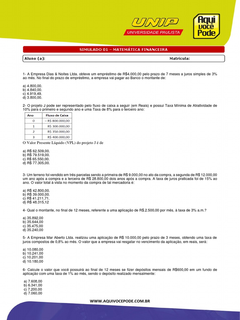 SIMULADO 01 – MATEMÁTICA FINANCEIRA