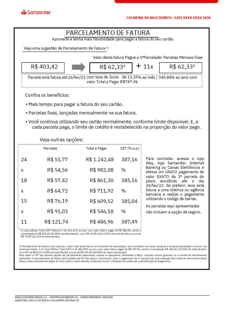 Santander. O parcelamento de fatura será acatado até 05 dias após o vencimento. Caso o pagamento da 1ª parcela não seja realizado até a data de vencimento desta