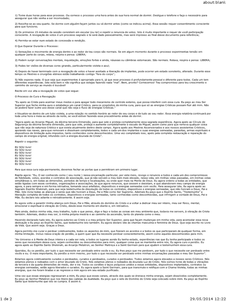 Repita agora: “Eu, O ser conhecido como ( seu nome ) nessa encarnação particular, por este meio, revogo e renuncio a todos e cada um dos compromissos