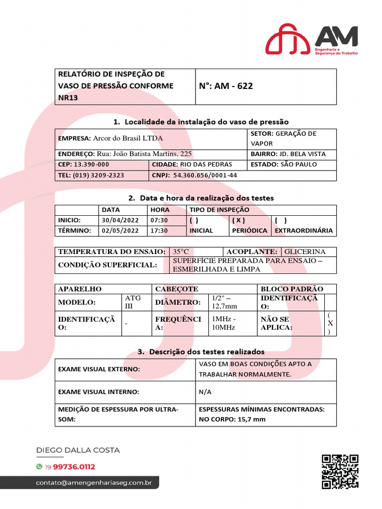 Nota: Conforme avaliado, devido à falta de projeto inicial do equipamento as espessuras