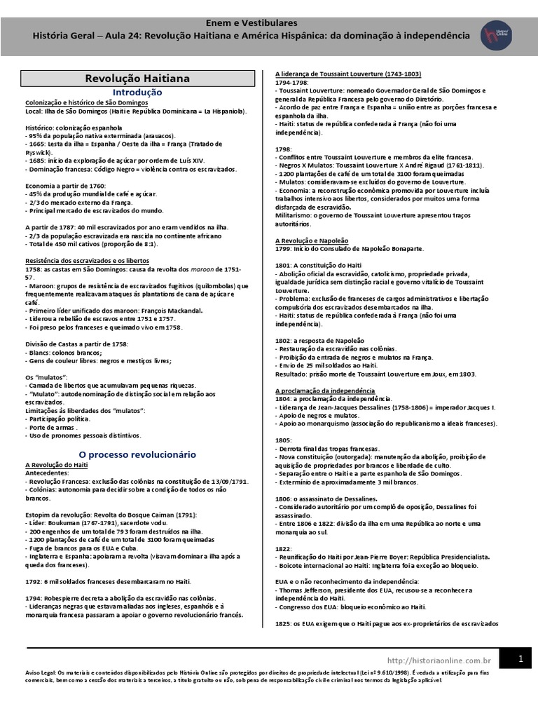 História Geral – Aula 24: Revolução Haitiana e América Hispânica: da dominação à independência