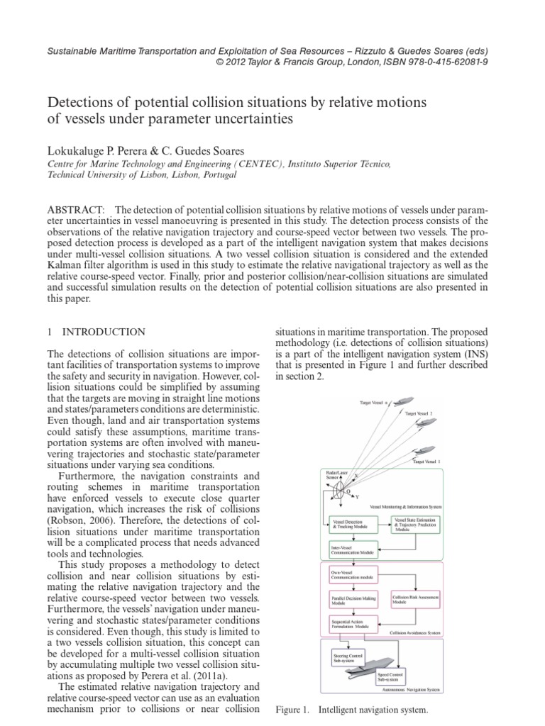 ABSTRACT: The detection of potential collision situations by relative motions of vessels under parameter uncertainties in vessel manoeuvring is presented in this study. The detection process consists of the observations of the relative navigation trajectory and course-speed vector between two vessels. The proposed detection process is developed as a part of the intelligent navigation system that makes decisions under multi-vessel collision situations. A two vessel collision situation is considered and the extended Kalman filter algorithm is used in this study to estimate the relative navigational trajectory as well as the relative course-speed vector. Finally, prior and posterior collision/near-collision situations are simulated and successful simulation results on the detection of potential collision situations are also presented in this paper. 1 INTRODUCTION situations in maritime transportation. The proposed methodology (i.e. detections of collision situations) is a part of the intelligent navigation system (INS) that is presented in Figure 1 and further described in section 2.