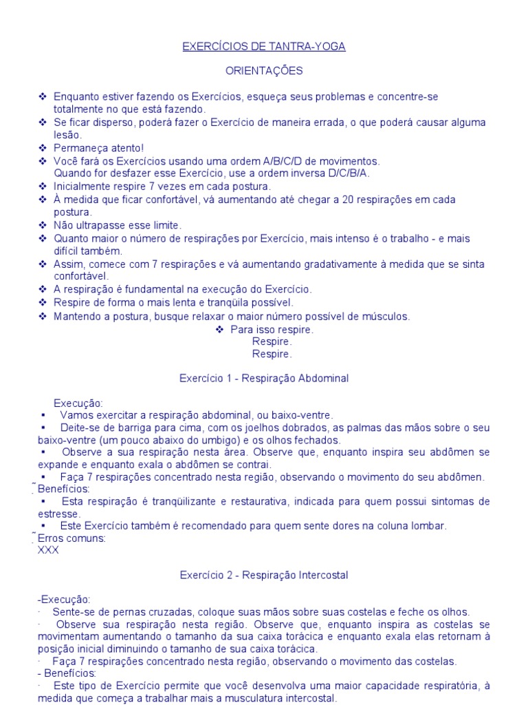 . Se ficar disperso, poder fazer o Exerccio de maneira errada, o que poder causar alguma leso. Permanea atento! Voc far os Exerccios usando uma ordem A/B/C/D de movimentos. Quando for desfazer esse Exerccio, use a ordem inversa D/C/B/A. Inicialmente respire 7 vezes em cada postura. medida que ficar confortvel, v aumentando at chegar a 20 respiraes em cada postura. No ultrapasse esse limite. Quanto maior o nmero de respiraes por Exerccio, mais intenso o trabalho - e mais difcil tambm. Assim, comece com 7 respiraes e v aumentando gradativamente medida que se sinta confortvel. A respirao fundamental na execuo do Exerccio. Respire de forma o mais lenta e tranqila possvel. Mantendo a postura, busque relaxar o maior nmero possvel de msculos. Para isso respire. Respire. Respire. Exerccio 1 - Respirao Abdominal Execuo: Vamos exercitar a respirao abdominal, ou baixo-ventre. Deite-se de barriga para cima, com os joelhos dobrados, as palmas das mos sobre o seu baixo-ventre (um pouco abaixo do umbigo) e os olhos fechados. Observe a sua respirao nesta rea. Observe que, enquanto inspira seu abdmen se expande e enquanto exala o abdmen se contrai. Faa 7 respiraes concentrado nesta regio, observando o movimento do seu abdmen. Benefcios: Esta respirao tranqilizante e restaurativa, indicada para quem possui sintomas de estresse. Este Exerccio tambm recomendado para quem sente dores na coluna lombar. Erros comuns: XXX Exerccio 2 - Respirao Intercostal -Execuo: Sente-se de pernas cruzadas, coloque suas mos sobre suas costelas e feche os olhos. Observe sua respirao nesta regio. Observe que, enquanto inspira as costelas se movimentam aumentando o tamanho da sua caixa torcica e enquanto exala elas retornam posio inicial diminuindo o tamanho de sua caixa torcica. Faa 7 respiraes concentrado nesta regio, observando o movimento das costelas. - Benefcios: Este tipo de Exerccio permite que voc desenvolva uma maior capacidade respiratria, medida que comea a trabalhar mais a musculatura intercostal.
