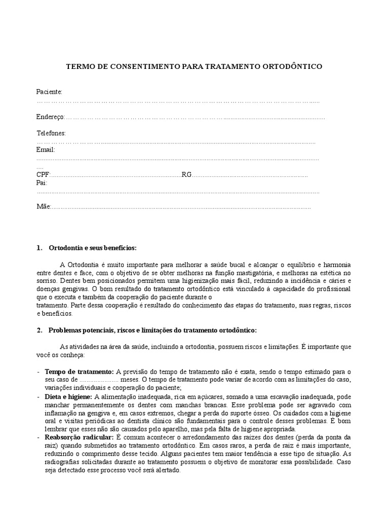 TERMO DE CONSENTIMENTO PARA TRATAMENTO ORTODÔNTICO