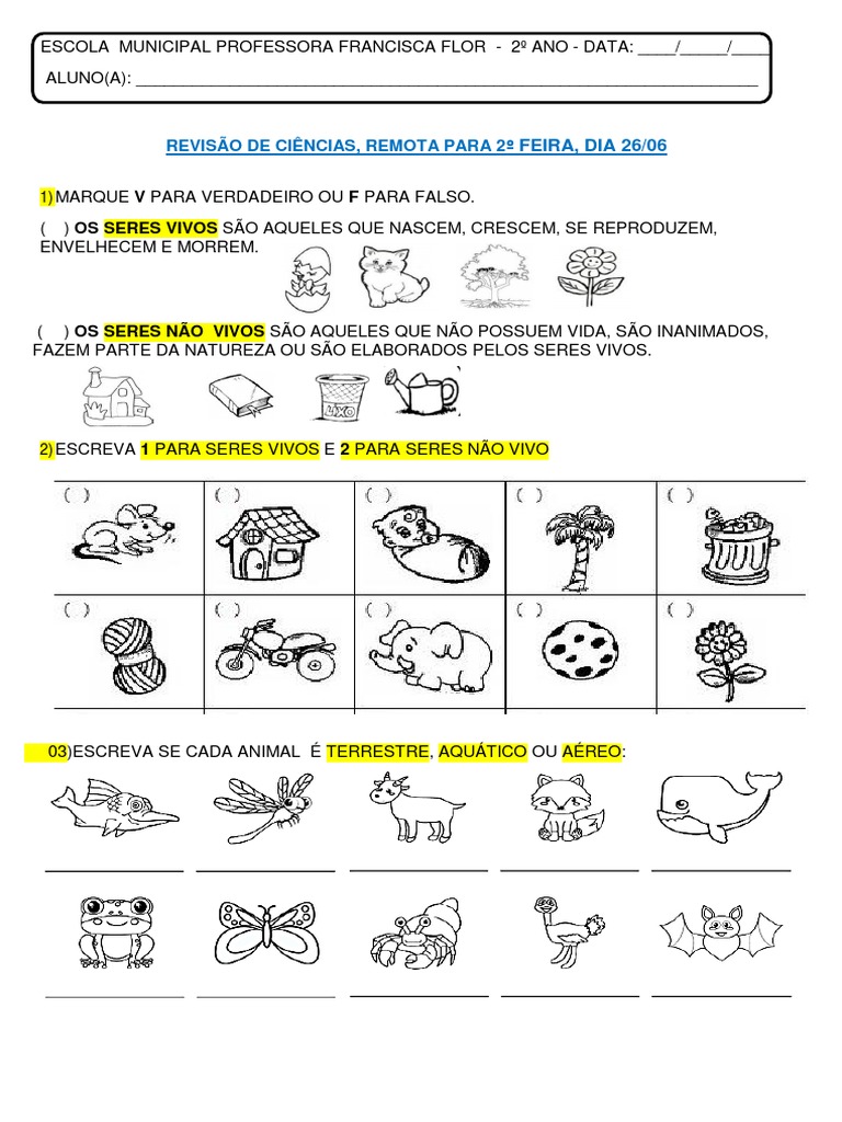 2) ESCREVA 1 PARA SERES VIVOS E 2 PARA SERES NÃO VIVO